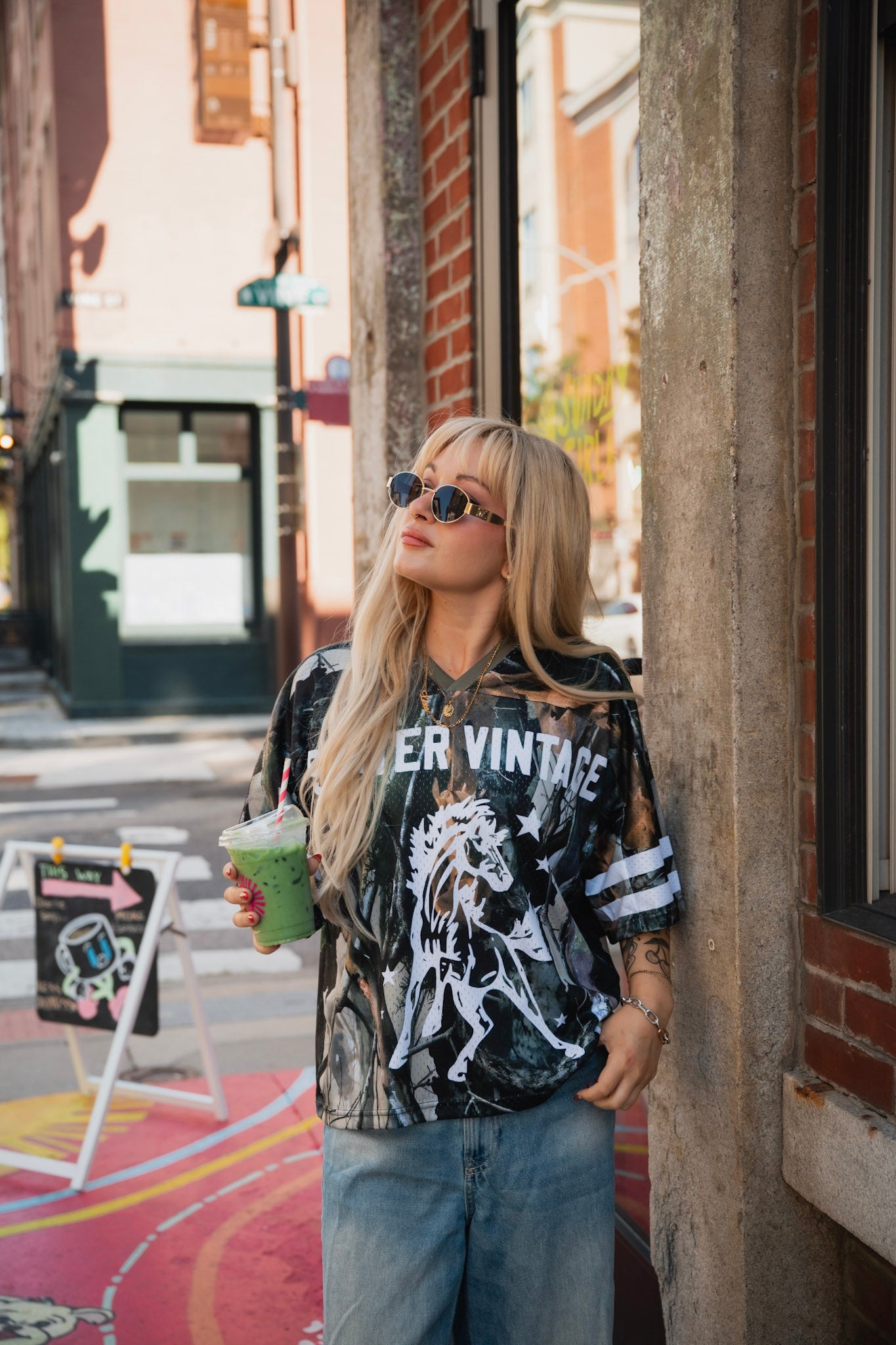 Vintage energy, oversized fit, and pure main character vibes. The Camo Jersey brings that worn-in look with bold graphics and a slouchy, street-ready silhouette. Lightweight and breathable — perfect for layering or rocking solo.